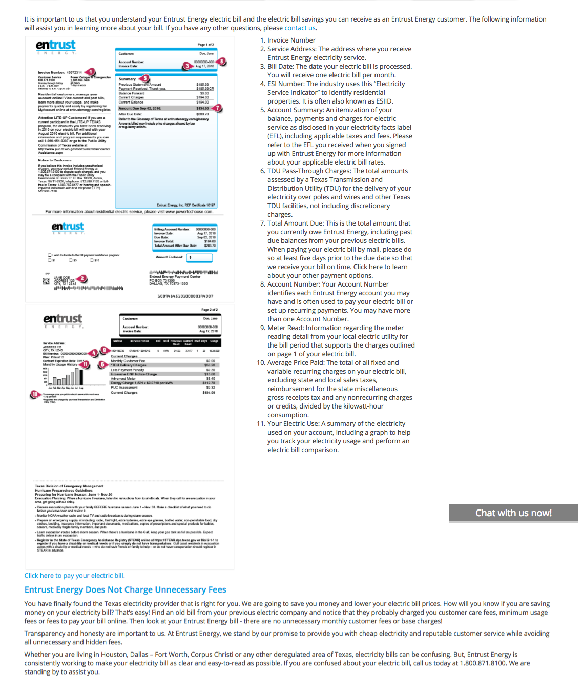 It is important to us that you understand your Entrust Energy electric bill and the electric bill savings you can receive as an Entrust Energy customer. The following information will assist you in learning more about your bill. Visit our FAQs for my information or contact us if you have any other questions.